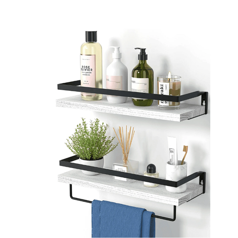 バスルームキッチンベッドルームリビングルーム用タオルバー付き2パック素朴な木製フローティング棚壁の装飾収納ラック
